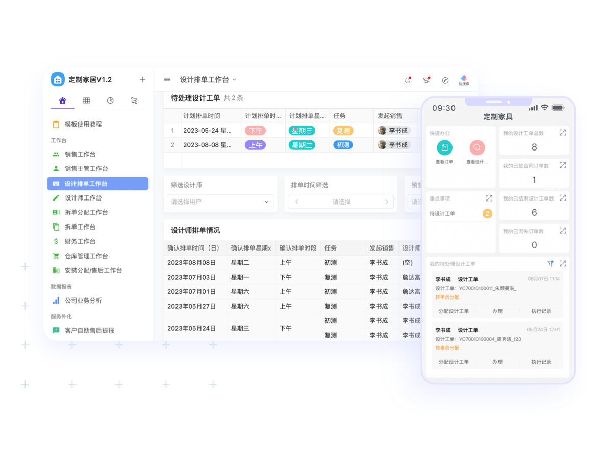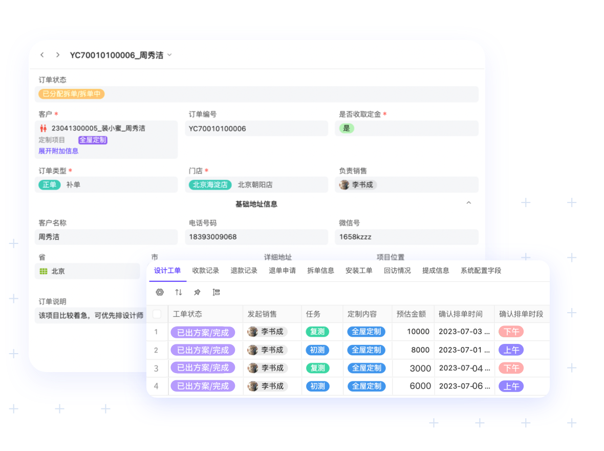 下單、設計、拆單、安裝過程涉及返工、多崗位協(xié)作,普通表單協(xié)作困難