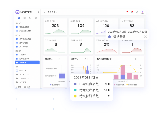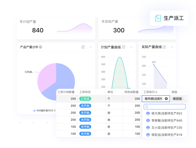 生產(chǎn)數(shù)據(jù)分析:企業(yè)計(jì)劃/實(shí)際產(chǎn)量,延期情況、生產(chǎn)效率、不良率按時(shí)間、按產(chǎn)品、按工序多維度分析,為企業(yè)生產(chǎn)決策保駕護(hù)航