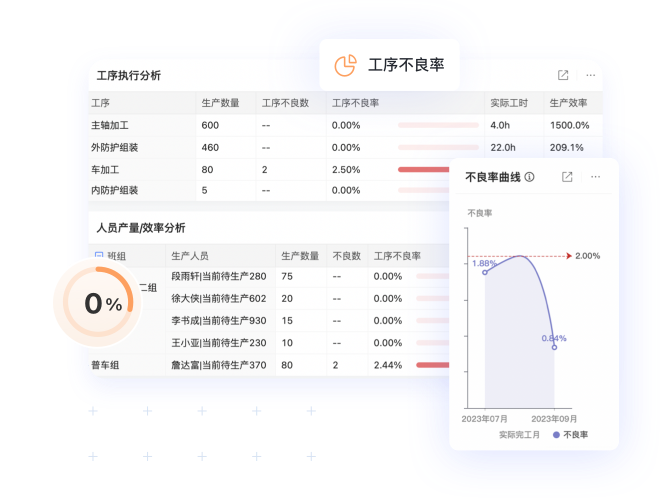 不良看板:不良率實(shí)時(shí)跟蹤,按產(chǎn)品按人按組按工序細(xì)化分析優(yōu)化,不良率降低49%