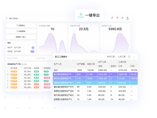 工資看板:員工工資排行;支持按班組、人員、時(shí)間查詢工資報(bào)表,一鍵導(dǎo)出
