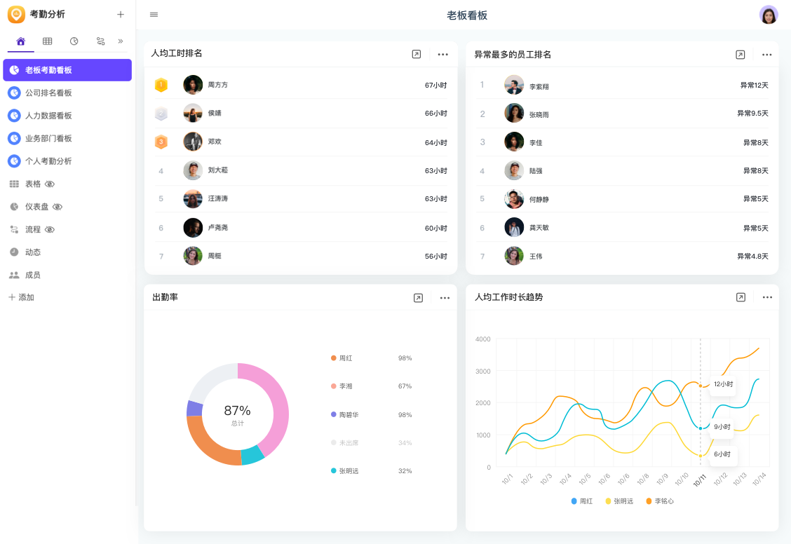連接企業(yè)微信「打卡」數(shù)據(jù),對(duì)日均工作時(shí)長、加班時(shí)長、異常頻次、到崗率、排名及變動(dòng)值等,進(jìn)行多維度自動(dòng)分析,一秒生成匯報(bào)報(bào)表,定時(shí)推送團(tuán)隊(duì)日?qǐng)?bào),讓態(tài)度成為增長第一加速度